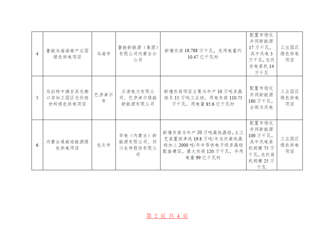 (三)內(nèi)蒙古通威綠色基材新能源項目。新增負(fù)荷為年產(chǎn)12萬噸工業(yè)硅,最大負(fù)荷24.5萬千瓦,年用電量18.6億千瓦時,項目配置市場化并網(wǎng)新能源容量35萬千瓦,其中風(fēng)電30萬千瓦,光伏5萬千瓦,配置8萬千瓦/6小時的熔融鹽儲能。
