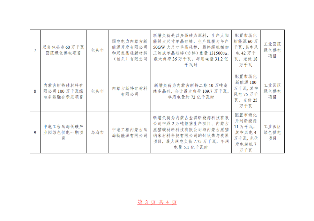 按照《內(nèi)蒙古自治區(qū)工業(yè)園區(qū)綠色供電項目實施細(xì)則2023年版(試行)》《內(nèi)蒙古自治區(qū)源網(wǎng)荷儲一體化項目實施細(xì)則2023年版(試行)》有關(guān)要求,內(nèi)蒙古自治區(qū)能源局同意實施內(nèi)蒙古翔福新能源有限責(zé)任公司源網(wǎng)荷儲一體化項目、寶武清能烏海高新技術(shù)產(chǎn)業(yè)開發(fā)區(qū)海勃灣產(chǎn)業(yè)園光伏綠色供電項目、內(nèi)蒙古通威綠色基材新能源項目、魯能烏海海南產(chǎn)業(yè)園綠色供電項目、烏拉特中旗甘其毛都口岸加工園區(qū)光伏硅材料綠色供電項目、內(nèi)蒙古通威硅能源綠色供電項目、雙良包頭市園區(qū)綠色供電項目、內(nèi)蒙古新特硅材料有限公司綠電多能融合示范項目、中電工程烏海低碳產(chǎn)業(yè)園綠色供電一期項目、錫林郭勒承接產(chǎn)業(yè)開發(fā)區(qū)寶昌產(chǎn)業(yè)園綠色供電項目,總計新能源規(guī)模583.5萬千瓦,現(xiàn)將有關(guān)要求通知如下。