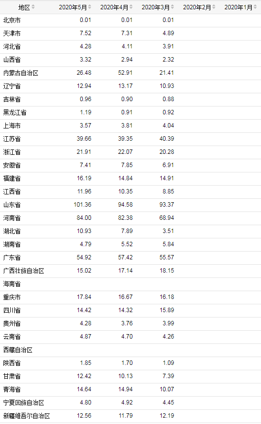 氧化鋁分地區(qū)月度產(chǎn)量(單位:萬噸)