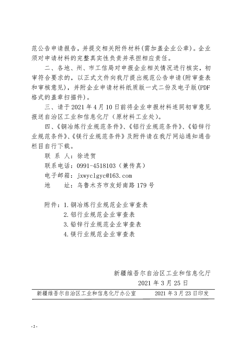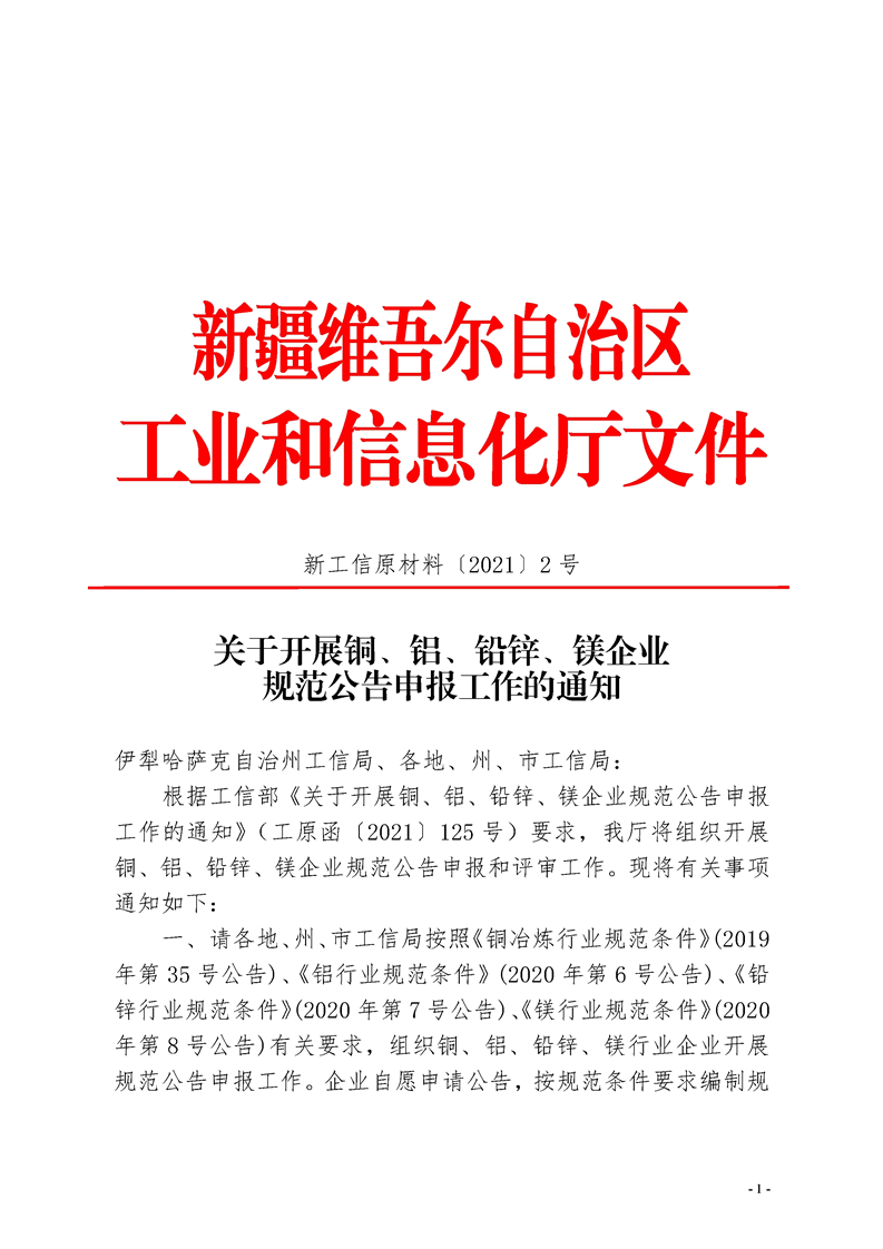 新疆關(guān)于開展銅、鋁、鉛鋅、鎂企業(yè)規(guī)范公告申報工作的通知