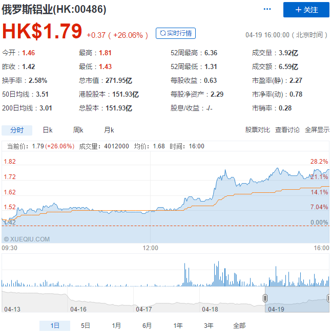 該消息公布后,在港交所上市的俄羅斯鋁業(yè)聯(lián)合公司股價大幅拉漲,截至收盤已漲26.06%。