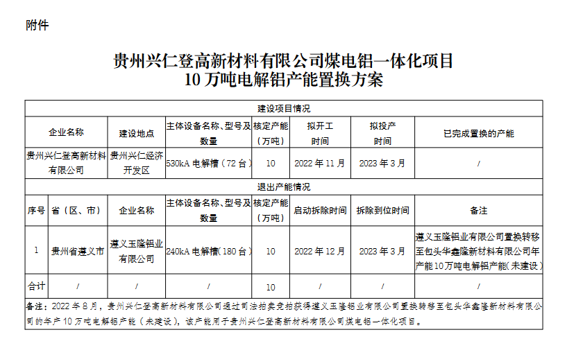 按照《國務(wù)院辦公廳關(guān)于營造良好市場環(huán)境促進有色金屬工業(yè)調(diào)結(jié)構(gòu)促轉(zhuǎn)型增效益的指導(dǎo)意見》和《工業(yè)和信息化部關(guān)于電解鋁企業(yè)通過兼并重組等方式實施產(chǎn)能置換有關(guān)事項的通知》的程序和要求,我廳于2022年11月7日-21日發(fā)布了《貴州興仁登高新材料有限公司煤電鋁一體化項目10萬噸電解鋁產(chǎn)能置換方案的公示》。公示期間,內(nèi)蒙古自治區(qū)工業(yè)和信息化廳和包頭華鑫隆新材料有限公司對方案中用于置換的年產(chǎn)10萬噸電解鋁產(chǎn)能指標(biāo)權(quán)屬和我廳開展公示工作的依據(jù)和程序提出異議,要求撤銷該公示。了解上述問題后,我廳及時與組織該指標(biāo)拍賣的遵義市中級人民法院對接溝通,根據(jù)該院提供的《執(zhí)行裁定書》((2022)黔03執(zhí)恢55號)《關(guān)于司法拍賣10萬噸電解鋁產(chǎn)能指標(biāo)權(quán)屬情況的復(fù)函》《協(xié)助執(zhí)行通知書》((2022)黔03執(zhí)恢55號之二)等法律文書,產(chǎn)能置換方案中的年產(chǎn)10萬噸電解鋁產(chǎn)能指標(biāo)權(quán)屬清楚,我廳按照人民法院和工信部原〔2018〕12號等政策文件要求進行的產(chǎn)能置換方案公示工作的依據(jù)和程序無誤。以上情況已書面正式反饋內(nèi)蒙古自治區(qū)工業(yè)和信息化廳和包頭華鑫隆新材料有限公司?,F(xiàn)將貴州興仁登高新材料有限公司煤電鋁一體化項目10萬噸電解鋁產(chǎn)能置換方案予以公告。
