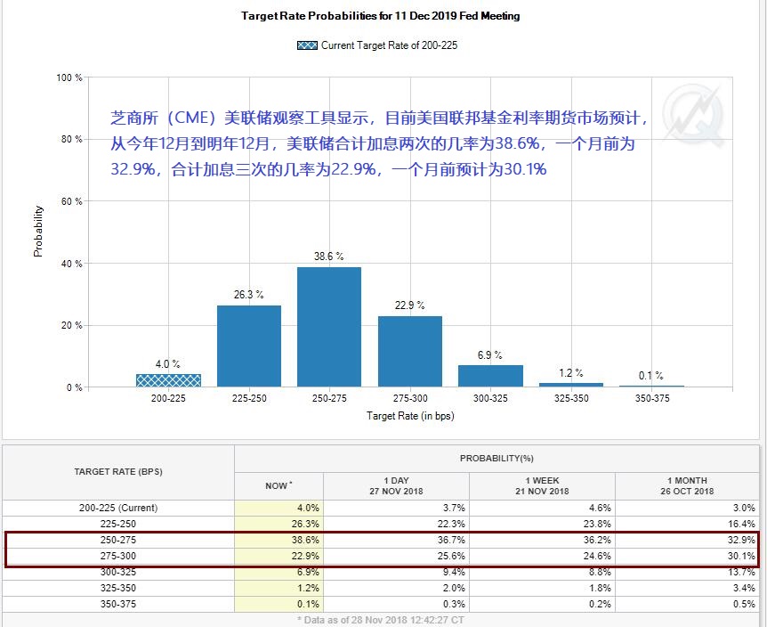 芝加哥商業(yè)交易所(CME)的“美聯(lián)儲觀察工具”顯示,若每次加息25個基點,目前美國聯(lián)邦基金利率期貨交易市場預計,從今年12月到明年12月,美聯(lián)儲合計加息兩次的幾率為38.6%,一天前預計為36.7%,一個月前為32.9%;合計加息三次的幾率為22.9%,一天前預計為25.6%,一個月前為30.1%。