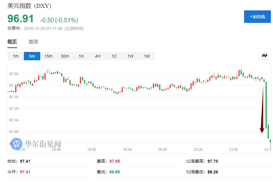 講話后不久,原本略微上漲的美元指數短線跳水,一度跌破96.90,日內跌幅逼近0.6%。