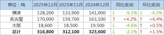 丸紅株式會(huì)社周四表示,截至12月底,日本三大主要港口的鋁庫(kù)存升至316,800噸,較前一個(gè)月增長(zhǎng)約1.5%。 丸紅的數(shù)據(jù)來(lái)自橫濱港、名古屋港和大阪港。