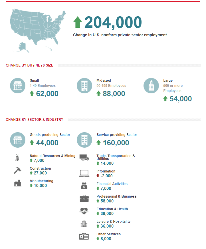 今日(5月2日),素有美國“小非農(nóng)”之稱的ADP數(shù)據(jù)顯示,4月美國私營部門非農(nóng)就業(yè)人口增加20.4萬,高于預(yù)期,并繼續(xù)保持在20萬以上就業(yè)人數(shù)增長。