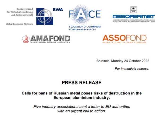 當(dāng)?shù)貢r(shí)間周一(10月24日),五家歐洲行業(yè)協(xié)會發(fā)表聯(lián)合聲明,鄭重呼吁歐盟阻止對俄羅斯的鋁禁運(yùn)、制裁、征收高額關(guān)稅等潛在的措施。