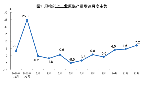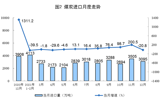 原煤生產(chǎn)繼續(xù)加快,進(jìn)口由增轉(zhuǎn)降。隨著增產(chǎn)保供政策持續(xù)推進(jìn),12月份,生產(chǎn)原煤3.8億噸,同比增長7.2%,增速比上月加快2.6個(gè)百分點(diǎn),比2019年同期增長10.7%,兩年平均增長5.2%,日均產(chǎn)量1241萬噸;進(jìn)口煤炭3095萬噸,同比下降20.8%。