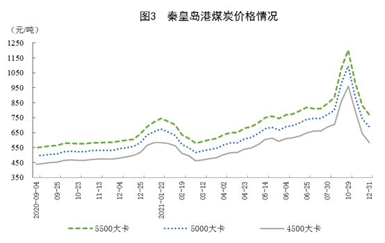 煤炭價(jià)格回落。12月31日,秦皇島港5500大卡、5000大卡和4500大卡動(dòng)力煤綜合交易價(jià)格分別為每噸773元、692元和584元,比11月26日分別回落213元、199元和208元。