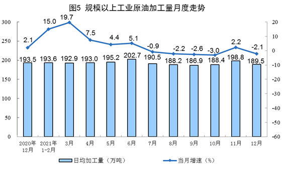 原油生產(chǎn)增速略有回落,加工量由增轉(zhuǎn)降。12月份,生產(chǎn)原油1647萬噸,同比增長1.7%,增速比上月放緩1.0個(gè)百分點(diǎn),比2019年同期增長2.6%,兩年平均增長1.3%,日均產(chǎn)量53.1萬噸;加工原油5873萬噸,同比下降2.1%,上月為增長2.2%,比2019年同期下降0.1%,兩年平均下降0.1%,日均加工189.5萬噸。