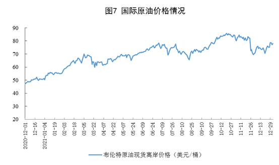 原油進(jìn)口由降轉(zhuǎn)增,國際原油價(jià)格上漲。12月份,進(jìn)口原油4614萬噸,同比增長19.9%,上月為下降8.0%;2021年,進(jìn)口原油51298萬噸,比上年下降5.4%。12月31日,布倫特原油現(xiàn)貨離岸價(jià)格為77.24美元/桶,比11月30日的70.86美元/桶上漲9.0%。