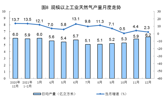 天然氣生產(chǎn)放緩。12月份,生產(chǎn)天然氣192億立方米,同比增長2.3%,增速比上月放緩2.1個(gè)百分點(diǎn),比2019年同期增長16.4%,兩年平均增長7.9%,日均產(chǎn)量6.2億立方米。